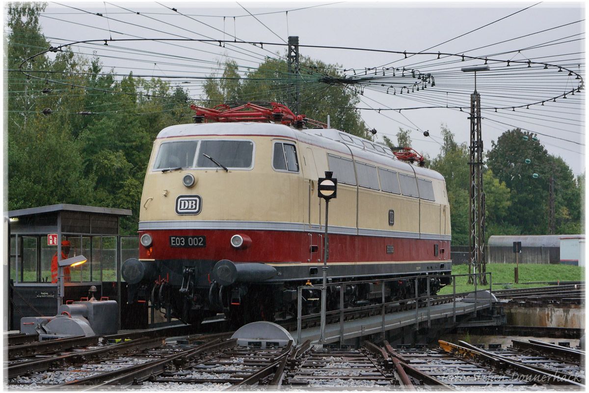 Im Rahmen der Zusammenarbeit des Bahnparks Augsburg und des Vereins Bayerisches Eisenbahnmuseum e.V. überwintert E 03 002 witterungsgeschützt im „Rundhaus Europa". Die Lok wurde dazu am 24. September 2025 nach Augsburg überführt. Sie wird dort genau 60 Jahre nach den vielbeachteten Schnellfahrten anlässlich der damaligen ‚Internationalen Verkehrsausstellung (IVA) 1965' zwischen Augsburg und München neben 120 003 ausgestellt.