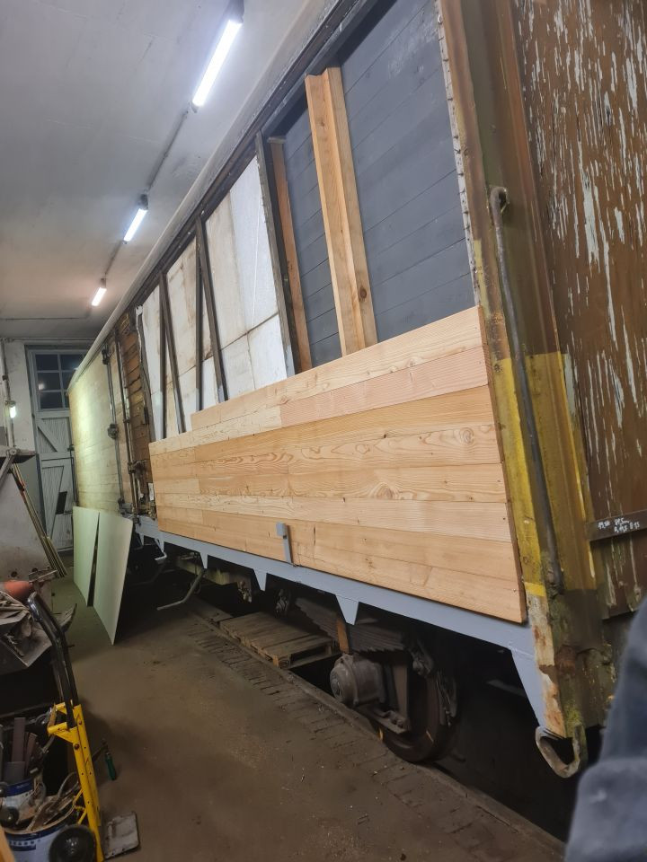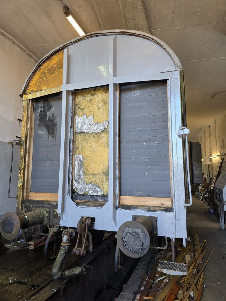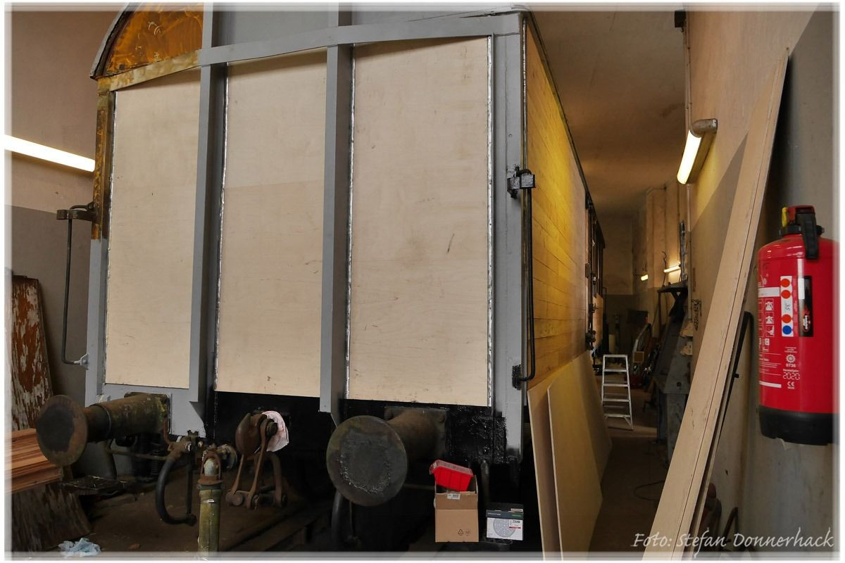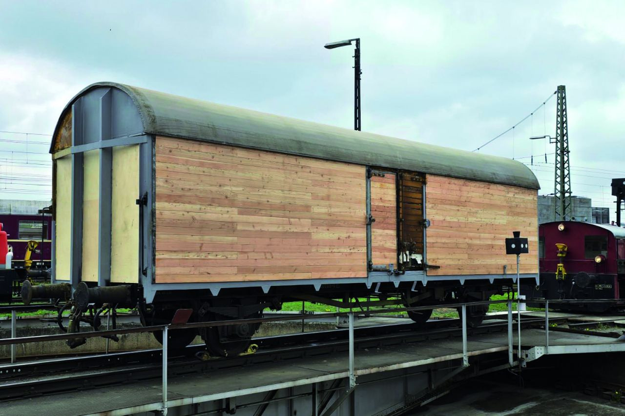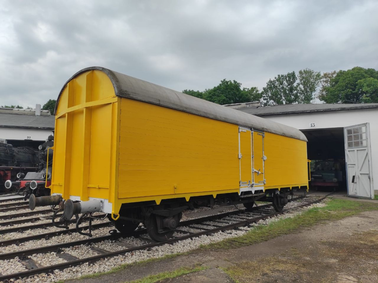 Im Winter 2024/25 begannen die eigentlichen Arbeiten am Fahrzeug. Zunächst erfolgte eine ganzheitliche Schadaufnahme sowie die Erneuerung der Beplankung inkl. einer punktuellen Instandsetzung der Unterkonstruktion. Parallel lief zwischen der Fa. Märklin und dem BEM die Abstimmung zur Beschriftung – schließlich wollte man nicht nur möglichst nahe an das historische Original herankommen, sondern Modell und Vorbild sollten sich natürlich auch nicht unterscheiden. Nach Abschluss der Holzarbeiten erfolgte im Mai 2025 noch der Grundanstrich in Gelb, bevor der Wagen zur Instandsetzung des Fahrwerks zur Fa. Railmaint nach Oberhausen (bei Neuburg/Donau) überstellt wurde. Nach einer grundhaften Instandsetzung kehrte der Wagen dann im August nach Nördlingen zurück, wo sogleich mit der Beschriftung begonnen wurde. Diese wurde mittels Farbe und Schablone durch die Fa. Blach aus Ansbach in bester Qualität vor Ort hergestellt. Dank der verlässlichen Arbeit aller Beteiligen konnte die technische Abnahme des Wagens am 10. September 2025 erfolgen und das entsprechende Untersuchungsdatum analog dem Modell angebracht werden. Erstmals präsentiert wurde der Wagen dann vom 19.-21. September 2025 im Rahmen der 14. Märklintage/Internationale Modellbahnmesse (IMA) in Göppingen. Gleichzeit erfolgte der Verkauf des als IMA-Sonderwagen angebotenen Modells im Märklineum sowie in den Ausstellungshallen des Stauferparks. Vorbild und Modell erfreuten sich dabei jeweils großer Beliebtheit. Zukünftig soll der Wagen nicht nur den historischen Fotogüterzug des BEM bereichern, sondern auch in den regulären Museumszügen des Vereins für den Fahrradtransport usw. eingesetzt werden. Der Dank für das gelungene Projekt gilt den genannten Partnern sowie den unermüdlichen Aktiven des BEM.