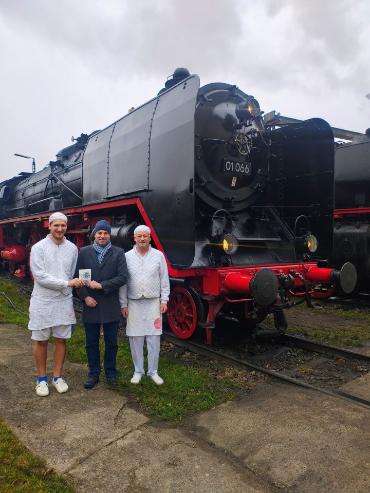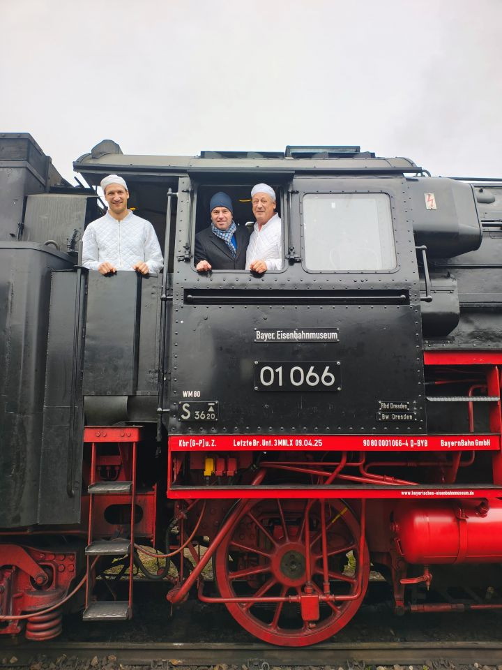 Bereits zum fünften Mal hat die Bäckerei Diethei aus Nördlingen die Lebkuchen für die Nikolausdampfzugfahrten des Bayerischen Eisenbahnmuseums e.V. regional hergestellt. Insgesamt waren 150 kg Nüsse, 150 Liter Milch, 120 kg Schokolade, 40 kg Honig und 40 kg Marzipan nötig, um die insgesamt 8000 Lebkuchen in Handarbeit herzustellen. Nach diesem Kraftakt haben Jonas und Rupert Diethei am 04.12.2025 den letzten Lebkuchen im Eisenbahnmuseum symbolisch übergeben. Ausgegeben werden diese vom Nikolaus persönlich an alle Kinder in den Dampfzügen „Rund um München", nach Salzburg sowie im Seenlandexpress nach Gunzenhausen. Der Seenland Express fährt in diesem Jahr am 07. Dezember um 09:38 Uhr sowie um 13:28 Uhr am Nördlinger Bahnhof ab. Mit ihm kann auch ganz bequem der Christkindlmarkt der Fa. Stark in Auhausen erreicht werden.